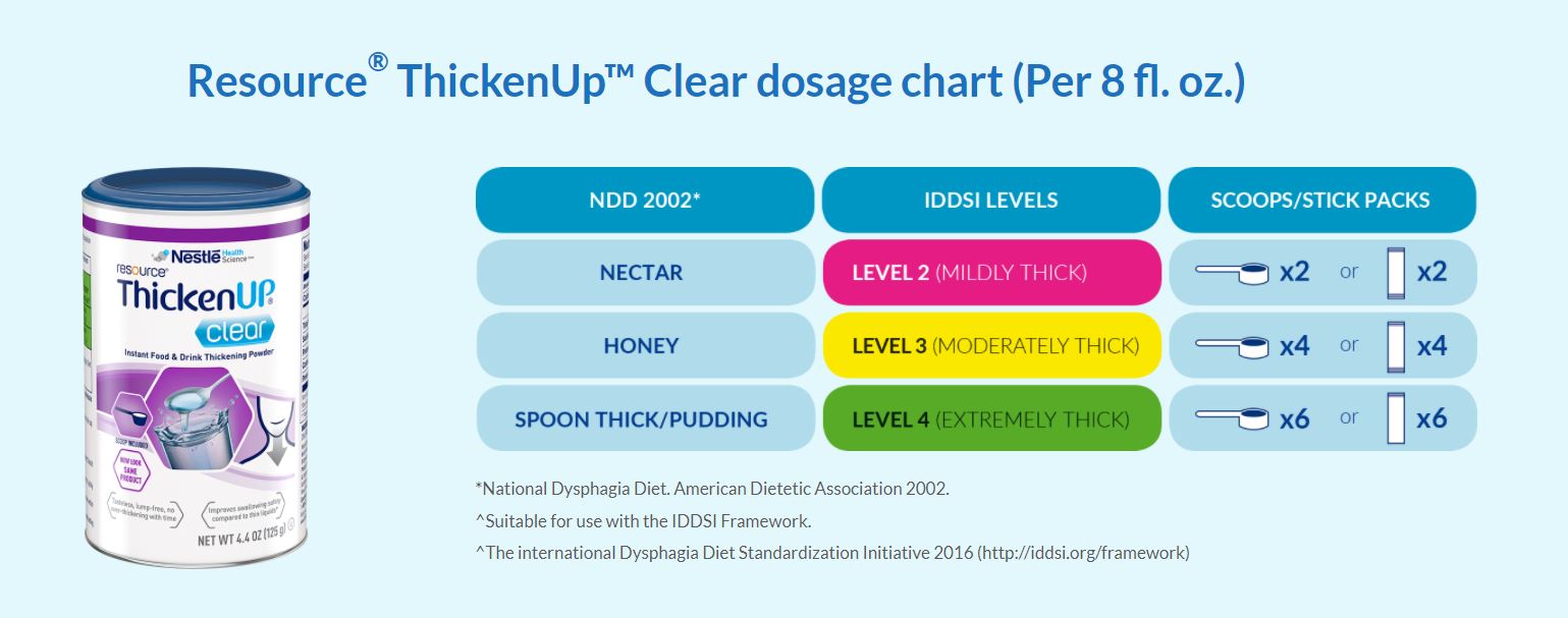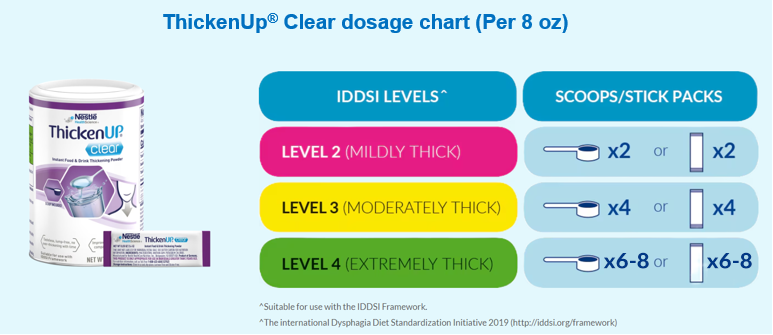 ThickenUP® Clear: This instant food and drink thickening powder helps improve swallowing safety compared to thin liquids for people with dysphagia; It doesn't over thicken with time, is flavorless, lump free and remains clear